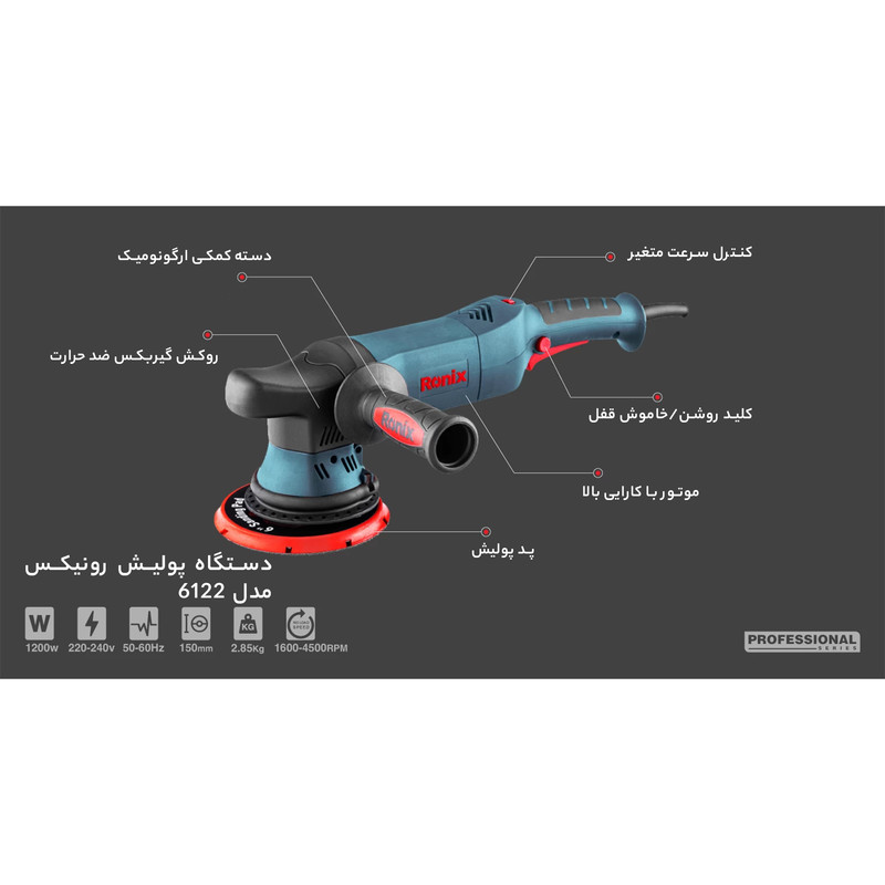 پولیش دیمردار اوربیتال رونیکس مدل 6122 دارای موتور پرقدرت باتوان 1200 وات میتواند سطوح صاف و براق و تمیزی ایجادو همینطور پولیش انواع صفحه را باقدرت و سرعت زیادی انجام داد. این دستگاه اصلا برای عملیات سنگ زنی مناسب نیست. در این دستگاه از گیربکس صنعتی و بلبرینگ های ضدغبار جهت افزای طول عمر دستگاه و اثربخشی بیشتر عملکرد استفاده شده است. اندازه قطر صفحه این مدل پولیش 150 میلی متر میباشد. پولیش رونیکس از قابلیت تنظیم دور در 6 حالت مختلف در کارایی های متنوع پولیش کاری و سنباده کاری برخورداراست. از دیگر مزایا این ابزار میتوان به روکش پلاستیکی ضدحرارت روی گیربکس جهت سهولت درپولیشکاری، دسته جانبی برای تسلط بیشتر و وجود پدپولیشکاری مخصوص اشاره کرد.